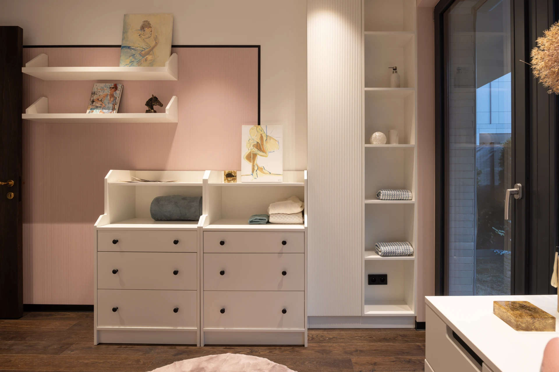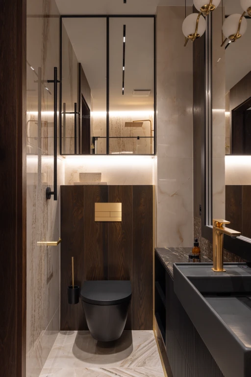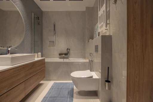 Łazienka została zaprojektowana jako przestrzeń relaksu – dominują w niej jasne płyty inspirowane kamieniem, drewno i ciepłe światło. Geometryczny układ płytek, minimalistyczna armatura i dyskretne oświetlenie podkreślają czystość formy. Wszystko jest przemyślane, ale nie przesadzone – estetyka idzie tu w parze z funkcjonalnością.