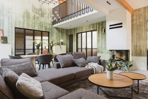 Już od progu czuć tu konsekwencję koncepcji – neutralne, stonowane tło wzbogacono akcentami zieleni, błękitów i terakoty, a całość uzupełniają naturalne materiały: drewno i kamień. Ponad sześciometrowa ściana w salonie, obłożona grafiką ścienną, staje się tłem dla codziennych spotkań domowników. Jej malarskie, leśne tonacje współgrają z widokiem za oknami, tworząc iluzję, że ogród płynnie przechodzi do wnętrza.