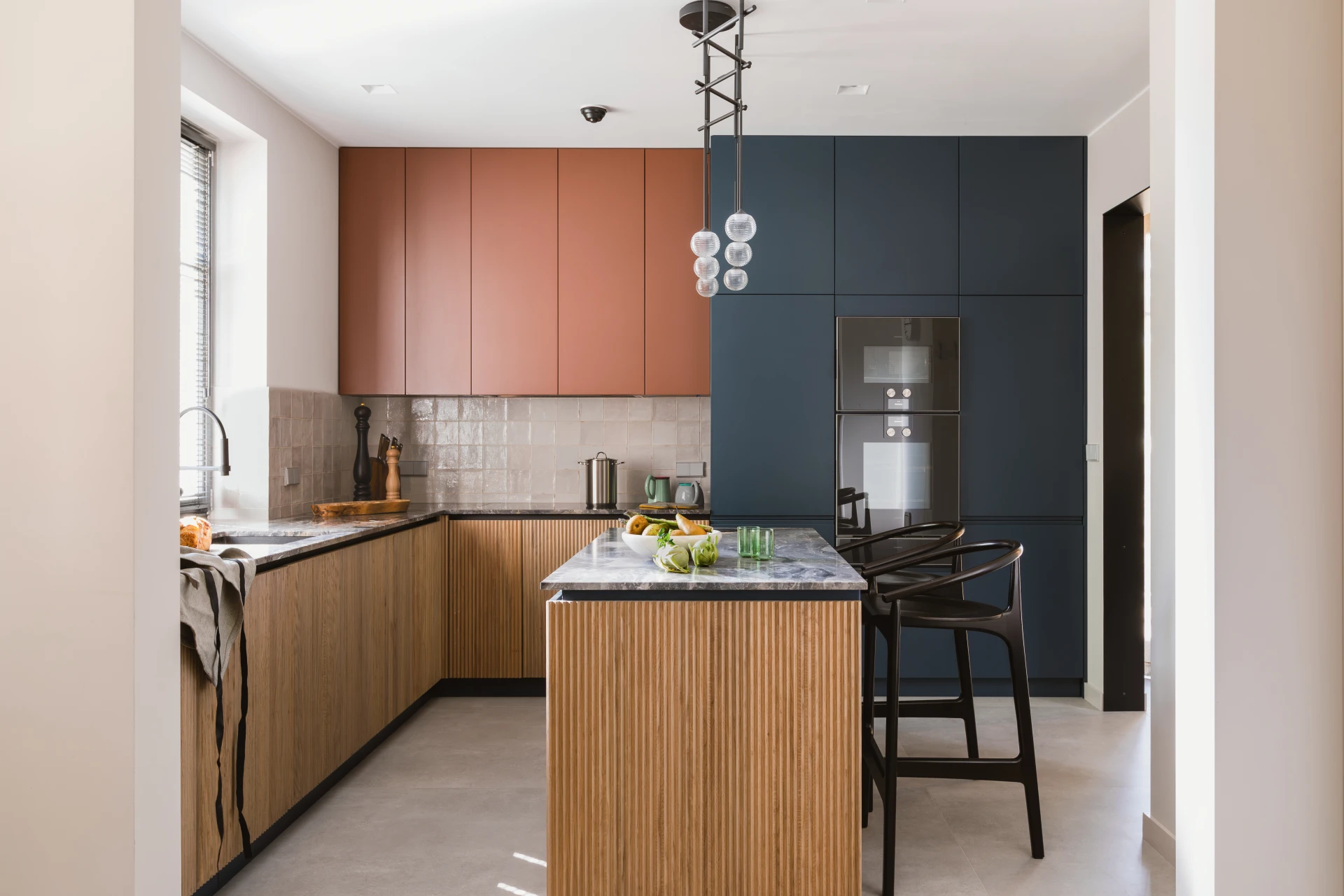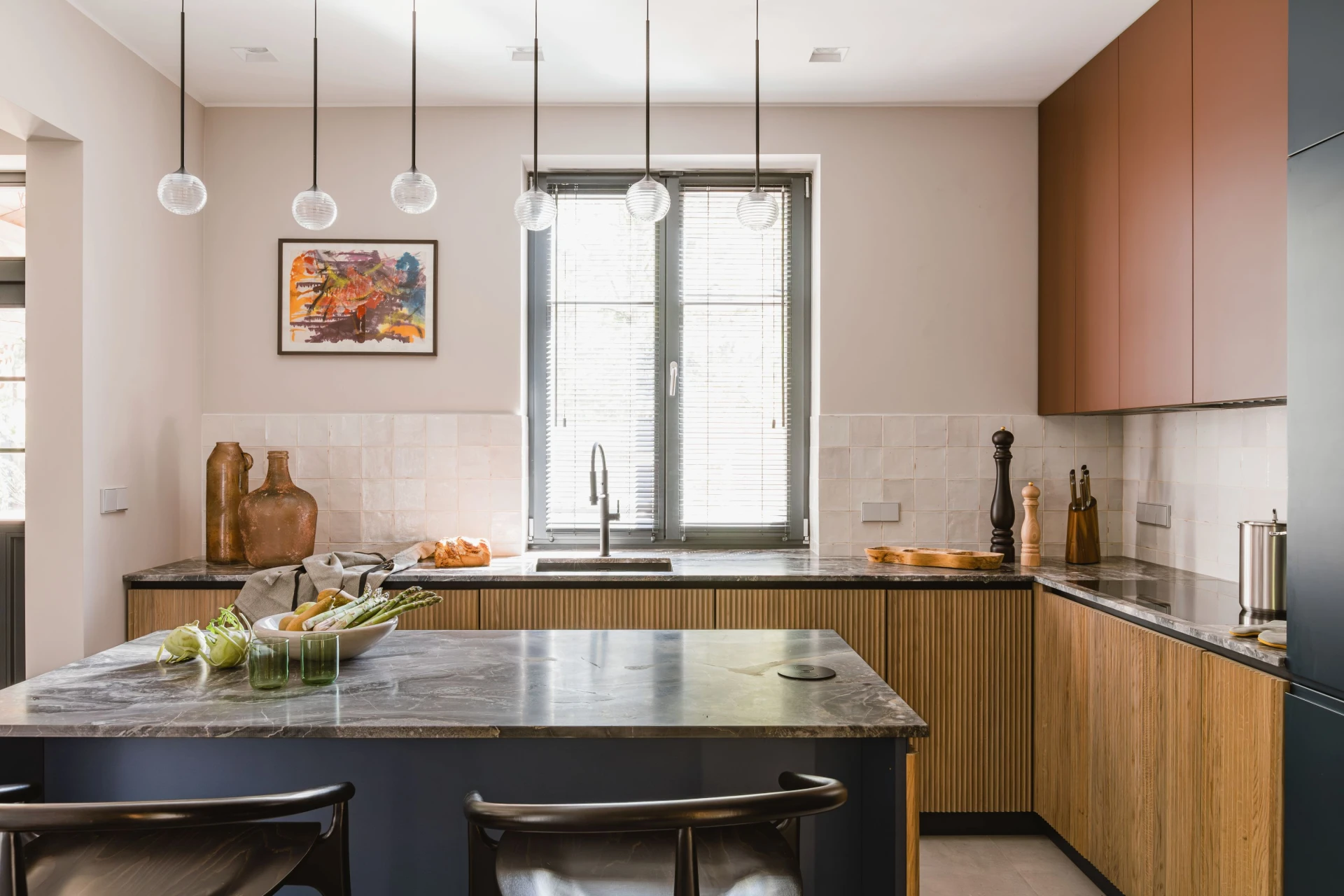 We wnętrzu znalazły się starannie wyselekcjonowane materiały wykończeniowe: drewniana podłoga Nobifloor, tapety w sypialniach oraz spieki kwarcowe Laminam na blatach – wszystkie zamówione w sieci Dekorian Home. To one, obok dopracowanego oświetlenia i subtelnych dekoracji,nadają całości elegancji i trwałości.