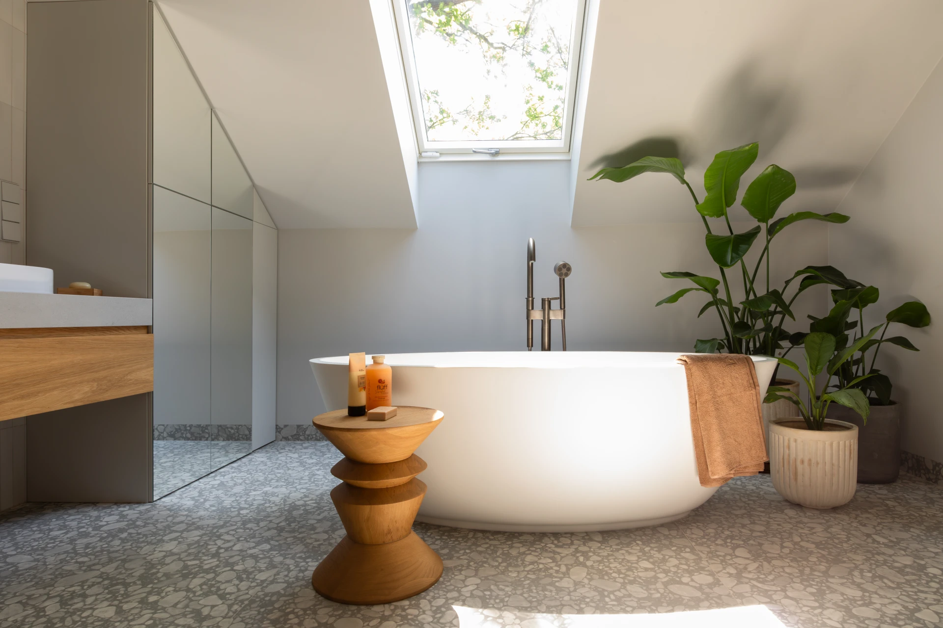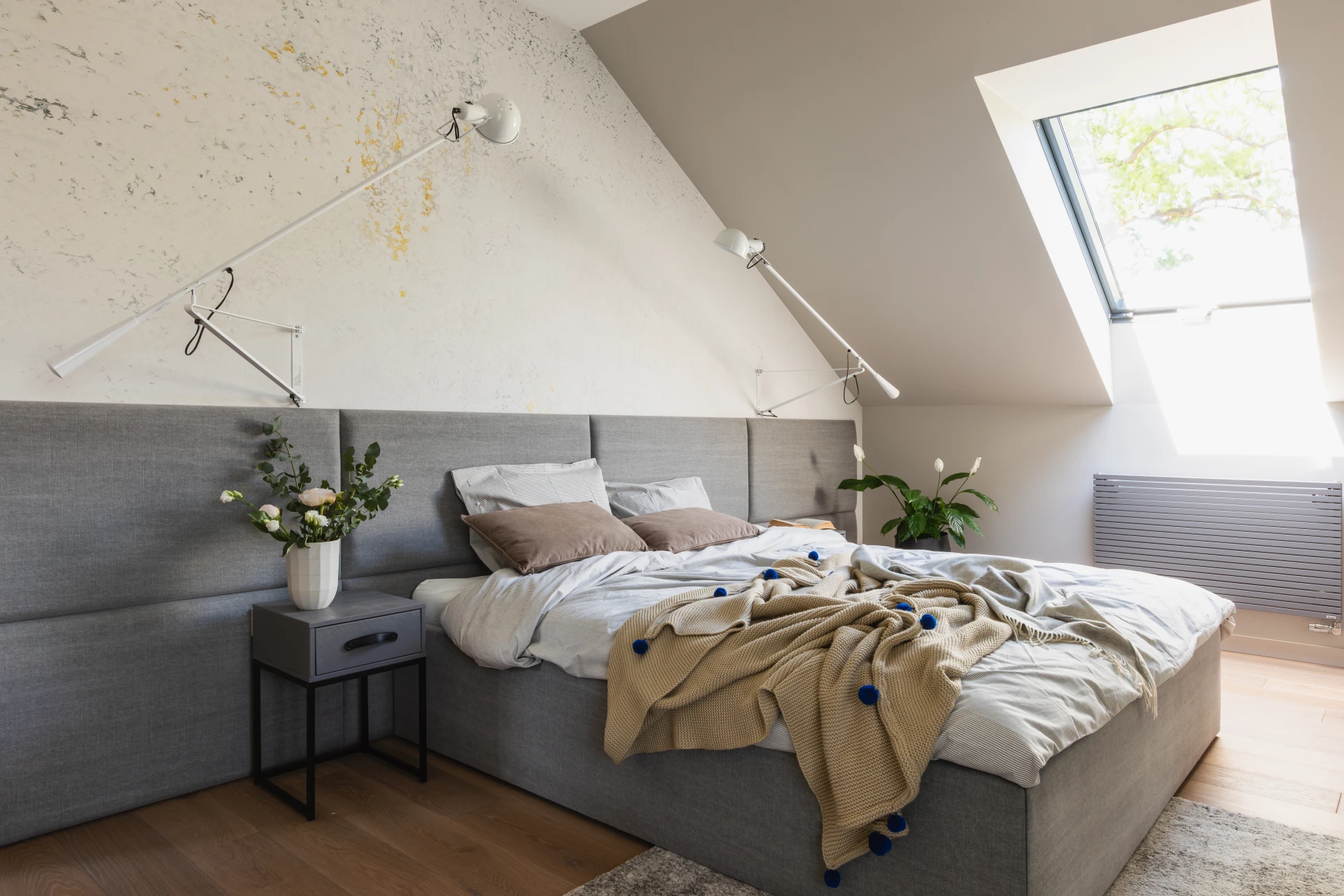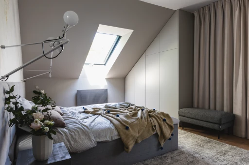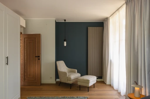 Na piętrze mieszczą się trzy sypialnie oraz łazienka z wanną wolnostojącą. Każda z nich zachowuje spójny charakter całego domu, ale ma swój własny klimat. Jasne ściany, tapicerowane zagłówki i miękkie tkaniny budują atmosferę relaksu, a duże okna wpuszczają obfite światło dzienne.