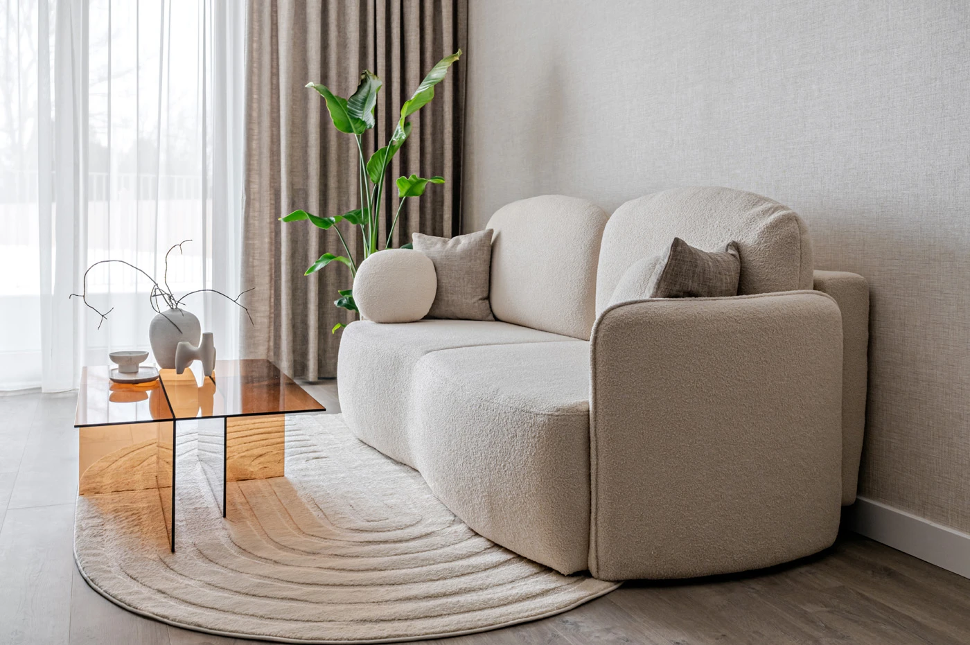 Aranżacja utrzymana jest w stylistyce nowoczesnej z dyskretnymi odniesieniami do klasyki. Proste bryły mebli ruchomych zestawiono z formami o miękkich liniach, co wprowadza zróżnicowanie bez nadmiernej ekspresji. W sypialni za łóżkiem zastosowano przedściankę eksponującą abstrakcyjną tapetę, która stanowi wyrazisty akcent w stonowanym otoczeniu.
