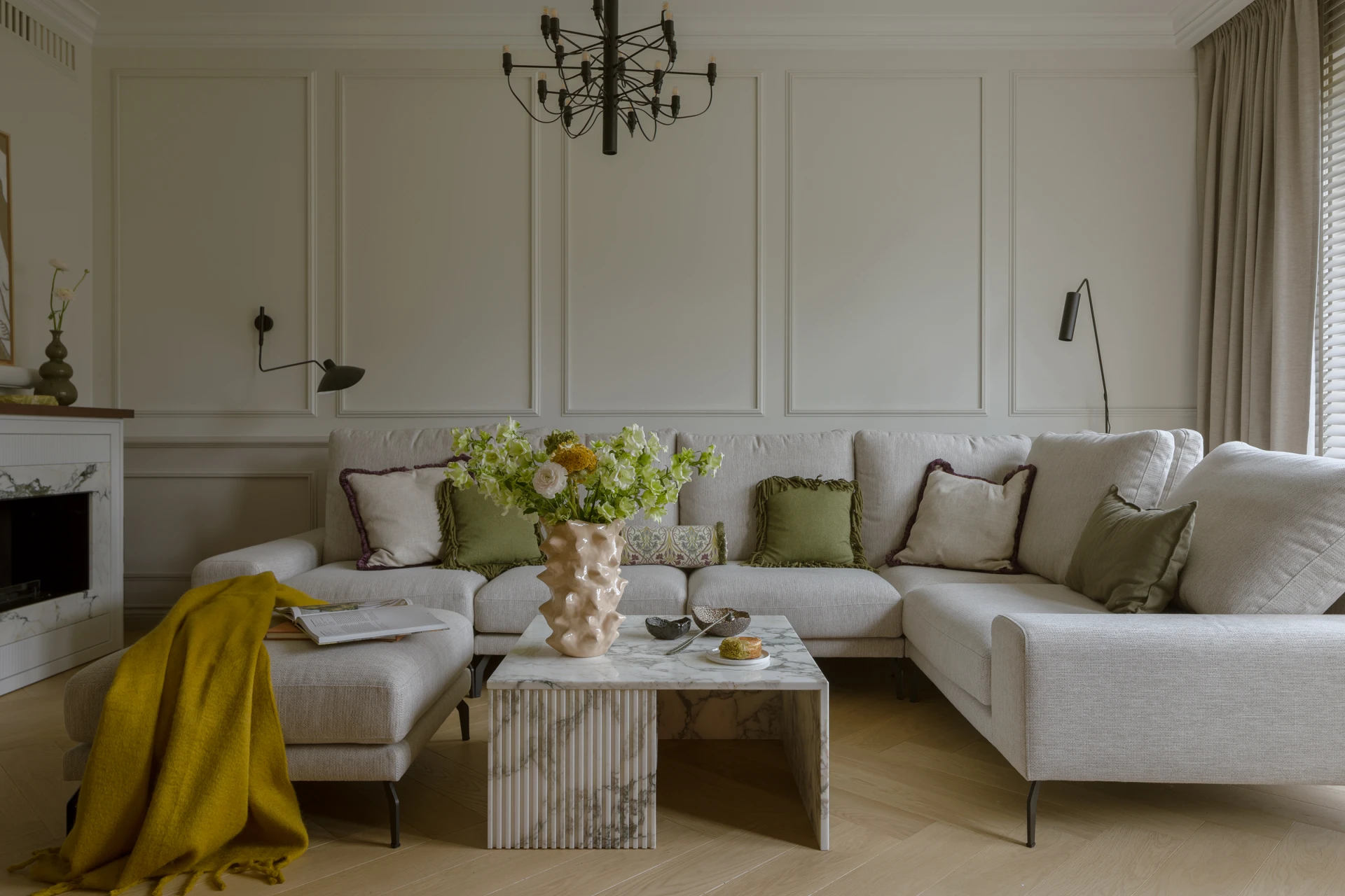 Florystyka to nie tylko zawód, ale sposób postrzegania świata - przez fakturę, zapach, gest. Dlatego projektantka chciała, by mieszkanie było jak ogród zimowy: pełne światła, ale nie krzykliwe, harmonijne w proporcjach i kolorach. Dominują beże, ciepłe szarości i naturalne tony, które stapiają się w spójną, miękką całość.
