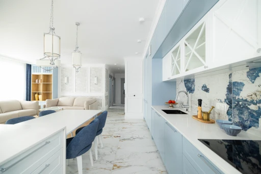Obyło się bez rewolucji w układzie funkcjonalnym. Drobny lifting przeszła jedynie część salonowa – architektka delikatnie przesunęła jedną ze ścian, żeby bardziej otworzyć przestrzeń, uczynić ją przestronną i jasną. Ponieważ właścicielki lubią od czasu do czasu coś upichcić, podjąć kolacją rodzinę czy znajomych, Marta zaproponowała całkiem sporą, otwartą na salon kuchnię. Zabudowa meblowa zajęła całą jedną ścianę – proste fronty szafek zostały ozdobione delikatnymi frezowaniami, a sznytu dodał pastelowy błękit – ulubiony kolor sióstr. Nad blatem roboczym zawisły mniejsze białe witrynki, z ozdobnymi szprosami. Takie same jak w przeszklonych frontach, które wykańczają od strony salonu niewielki półwysep. Jego przedłużeniem jest dostawiony stół z tapicerowanymi szmaragdową tkaniną fotelikami – kiedy zajdzie potrzeba można go rozłożyć tworząc jadalnię nawet dla kilkunastu osób.