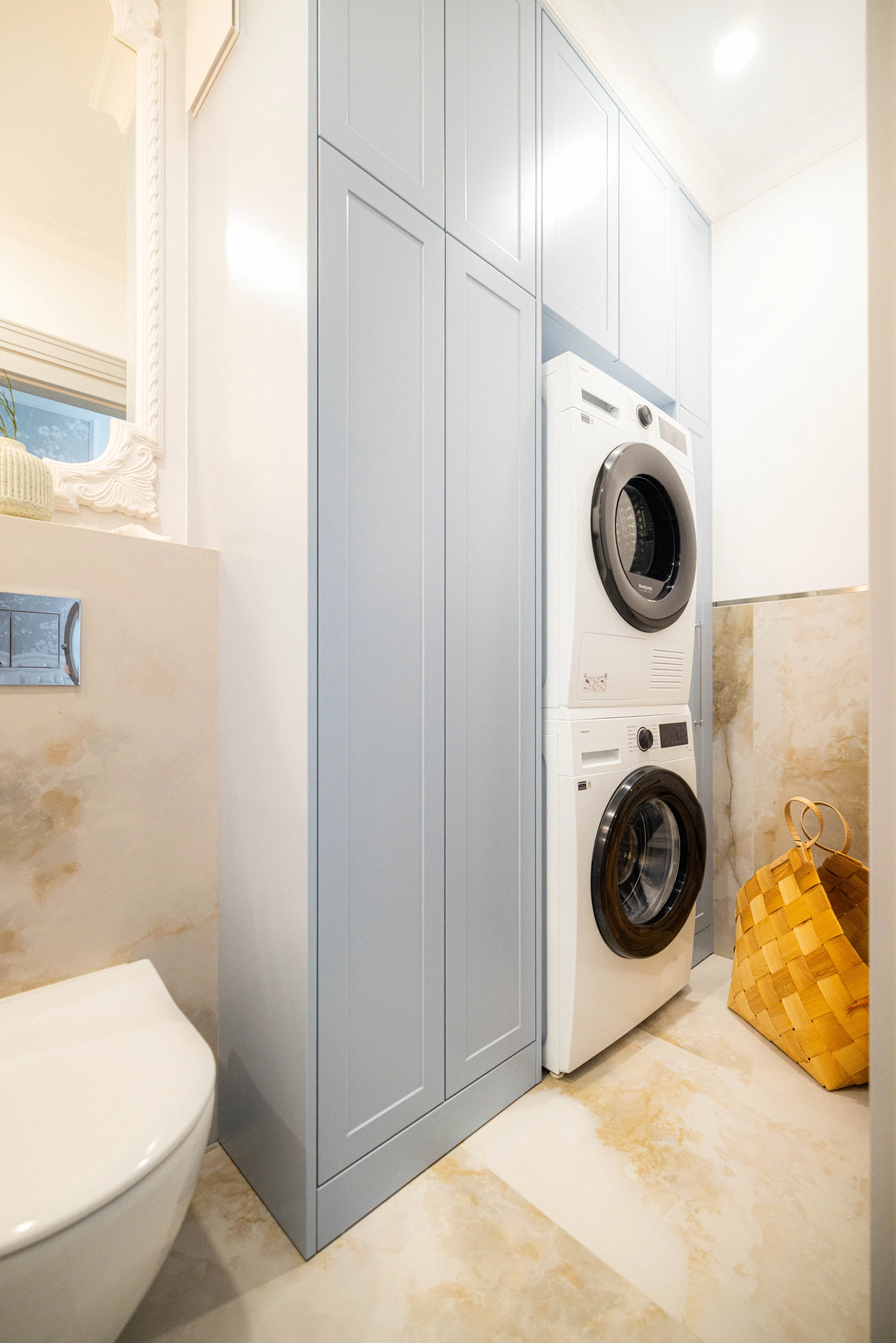 W wąskim korytarzu łączącym część dzienną z prywatną udało się wygospodarować dwie łazienki. Mniejsza, gościnna, pełni też rolę pralni (w zabudowę meblową wstawiono pralkę oraz suszarkę), większa jest prywatnym salonem kąpielowym właścicielek. Wannę zdecydowały się jednak zastąpić prysznicem typu walk-in, z szerokim, wygodnym wejściem i udogodnieniami, które ułatwią samodzielne i bezproblemowe funkcjonowanie w przyszłości. Zachowanie porządku ułatwia spora ilość miejsca do przechowywania – pod umywalkę zaprojektowana została duża podwieszana komoda z fornirowanymi szafkami i szufladami, a w ścianie nad toaletą ukryto stelaż wc oraz pojemne szafy i półki na podręczne kosmetyki i akcesoria. Stonowaną łazienkę rozświetla wielkie lustro i podświetlana posadzka z płyt gresowych imitujących efektowny onyks.